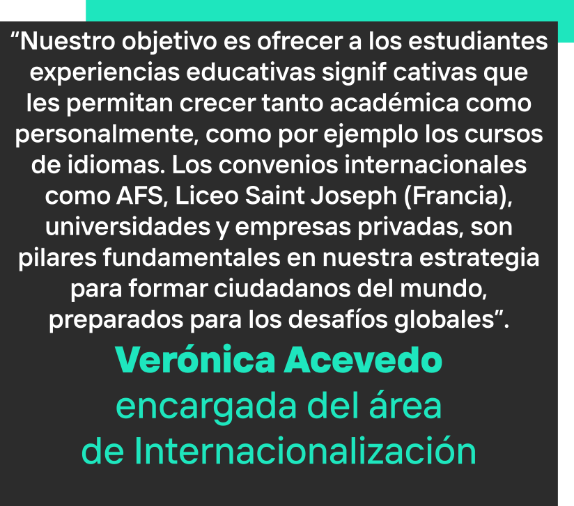 Uno de los aspectos más destacados de estos programas es la colaboración con instituciones educativas internacionales como Paraguay, Brasil, Francia, Italia y Nueva Zelanda, permiten a los estudiantes experimentar diferentes sistemas educativos y culturas. Los viajes de intercambio proporcionan una experiencia inmersiva, donde los estudiantes pueden poner en práctica sus conocimientos de idiomas y adaptarse a nuevos entornos, fomentando así su autonomía y capacidad de adaptación.